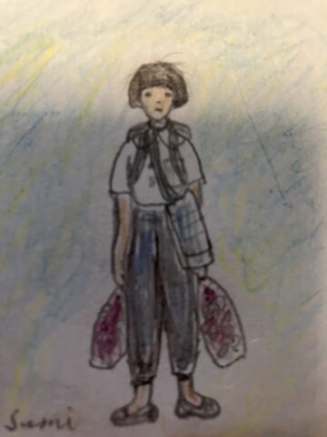 背中にはリュックサック、中には洗面具、箸、茶碗、コップ、胃腸薬などが入っていました。おかっぱ頭に青白い顔。白いブラウスにモンペ、すっぽりと足の入るゴム靴を履いていました。ブラウスの胸には大きな名札が縫い付けてありました。氏名、性別、年齢、生年月日、血液型、親の住所氏名、が白い布地に墨字で書かれていました。
