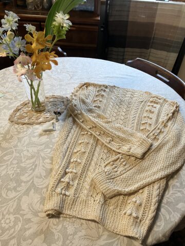 身頃と袖にサクランボをイメージしたコーン編みを入れ、縄編みと透かし編みでアクセントを付けたセーターです。
