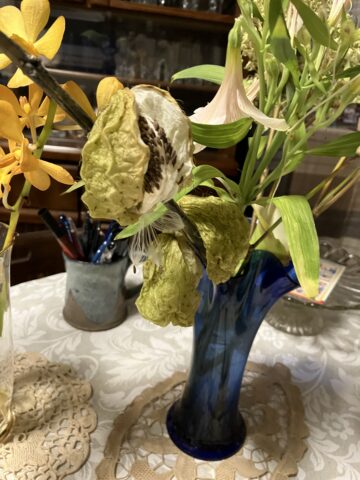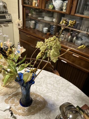 由芽ちゃんがこの間、プレゼントしてくれた花束のなかの珍しいフウセントウワタがはじけて、白い超細い絹糸のような綿? に、びっしりと黒い種を付けています。ヒオウギの実は、三番叟の小型の鈴のような型の実をつけています。